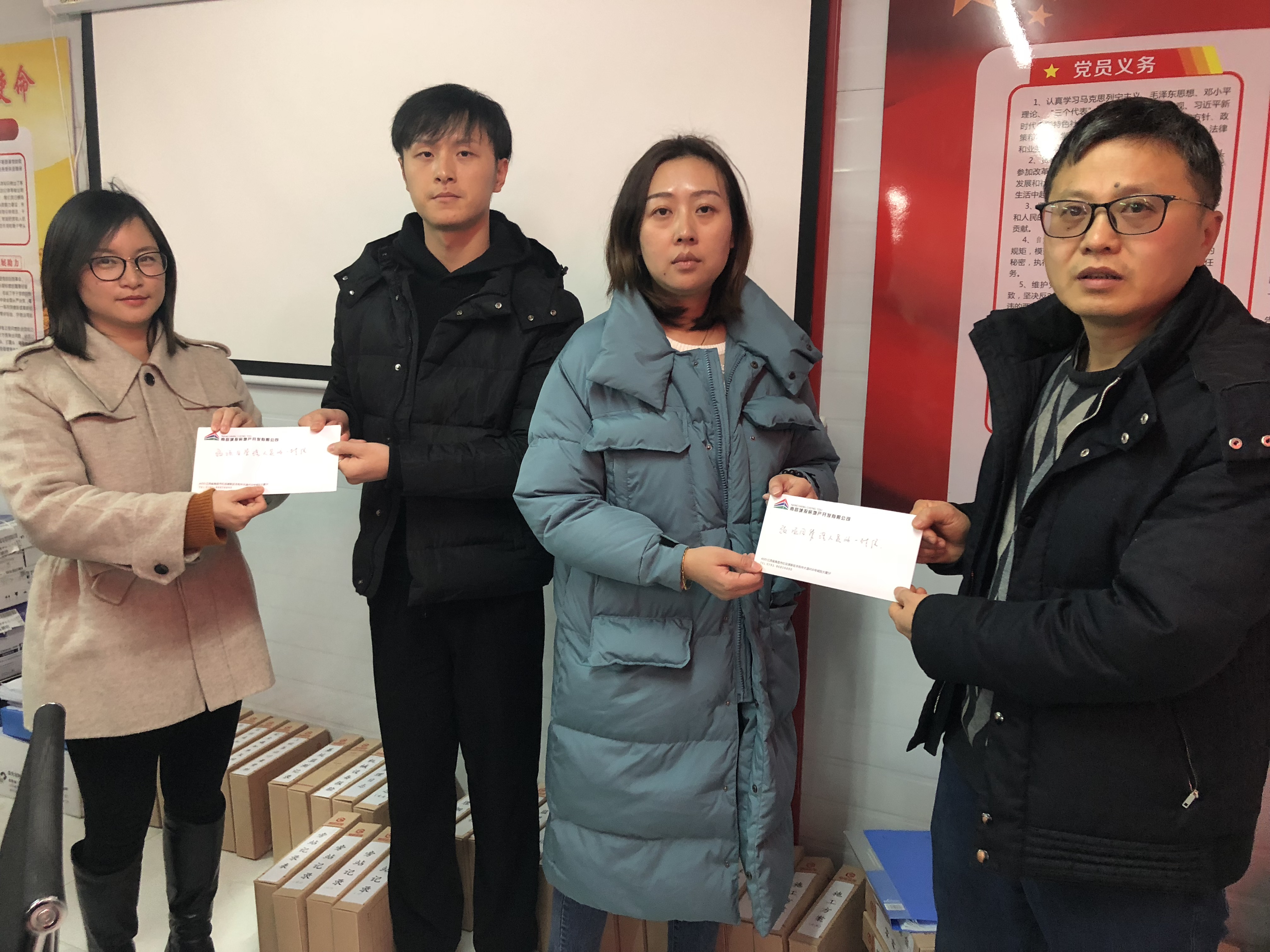 “政廉风正民心顺,,,,,,,纪肃法明万象新”。。。。。。。。新春佳节到来之际,,,,,,,为强化南昌城投房地产公司清廉文化建设,,,,,,,营造崇廉尚俭的节日气氛,,,,,,,助力南昌市中心城区棚户区刷新项目清廉高效的推进,,,,,,,城投房地产公司监察室深入棚改项目一线,,,,,,,向全体棚改项目治理职员发放《致公司项目治理职员的一封信》,,,,,,,共计25份。。。。。。。。